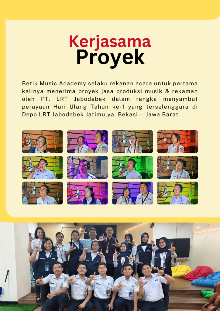 Betik Music Academy membuka peluang kerja sama untuk berbagai proyek musik dan penyelenggaraan acara seperti: konser, pertunjukan kolaboratif, pelatihan hingga kompetisi. Dengan pengalaman tim di bidang pengelolaan program musik, paduan suara, vokal solo, serta produksi artistik. Kami siap menjadi mitra profesional dalam mewujudkan konsep acara yang berkualitas dan berkesan. Mari berkolaborasi dan ciptakab karya serta pengalaman pertunjukan yang inspiratif bersama kami.
